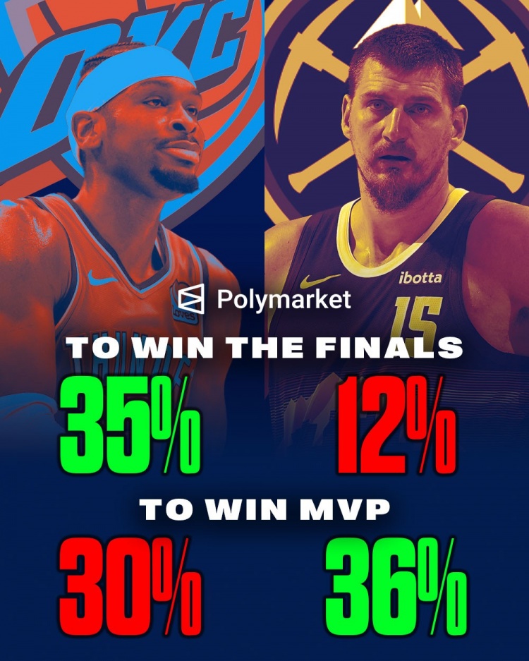 但在夺冠概率上,约基奇所在的掘金(12%)远低于雷霆(35%)。
