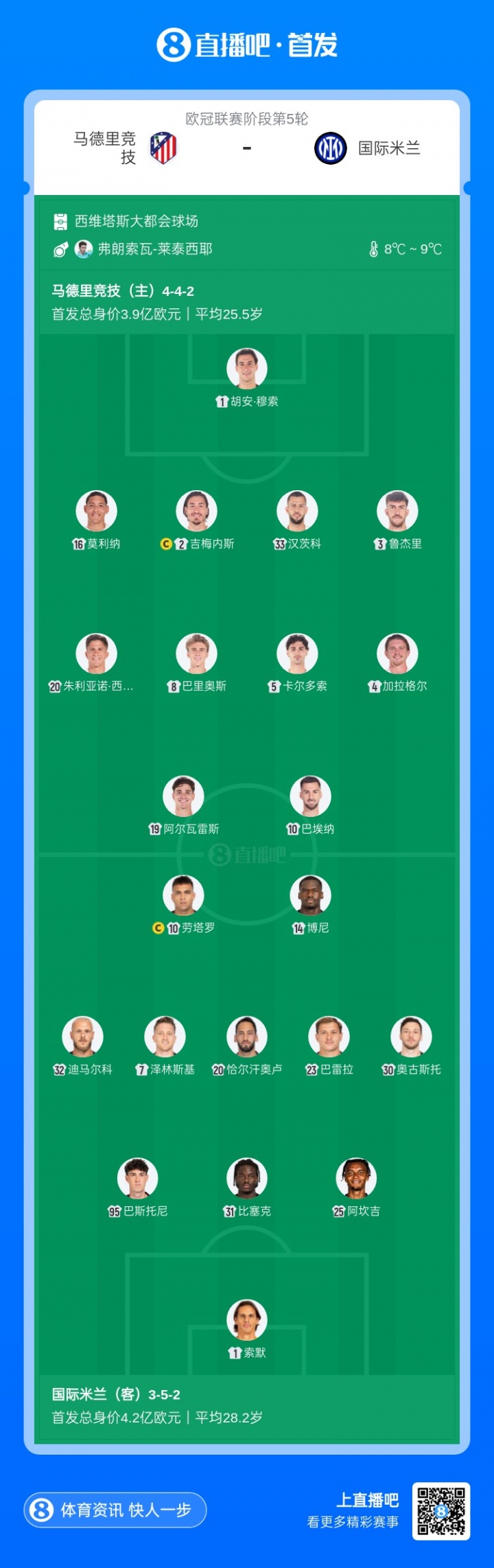 11月27日讯 北京时间11月27日凌晨4:00,欧冠联赛阶段第5轮,马竞vs国米。赛前双方公布了本场比赛的首发阵容。【马竞方面,小西蒙尼、加拉格尔、巴埃纳、阿尔瓦雷斯先发;国米方面,锋线劳塔罗搭档博尼,几天前米兰德比中首发的小图拉姆、苏西奇、阿切尔比替补待命。】