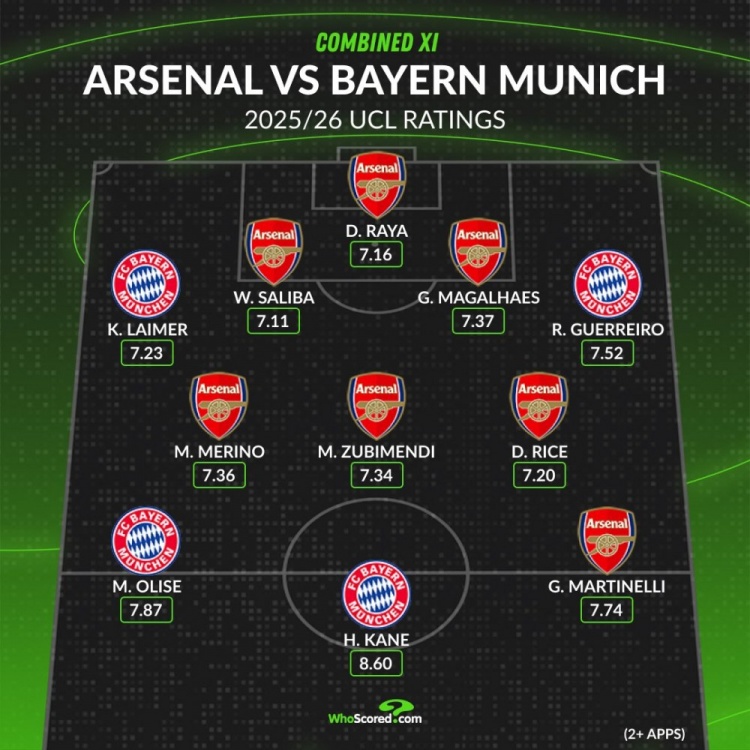 11月27日讯 拜仁将在本轮欧冠客战阿森纳,whoscored也列出了两队本赛季欧冠评分合体最佳阵,阿森纳7将在列。