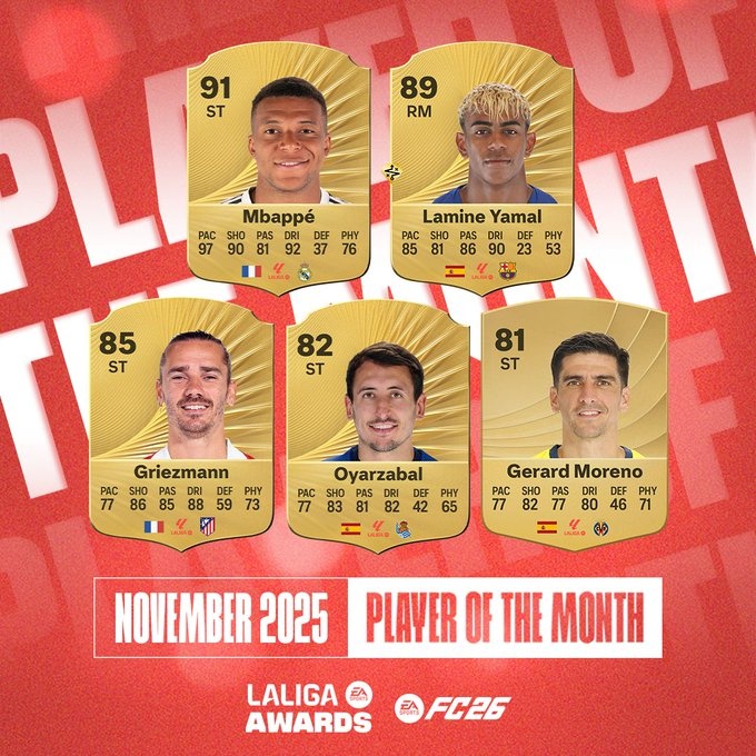 11月27日讯 西甲官方公布联赛11月最佳球员候选,格列兹曼、姆巴佩、亚马尔在列。