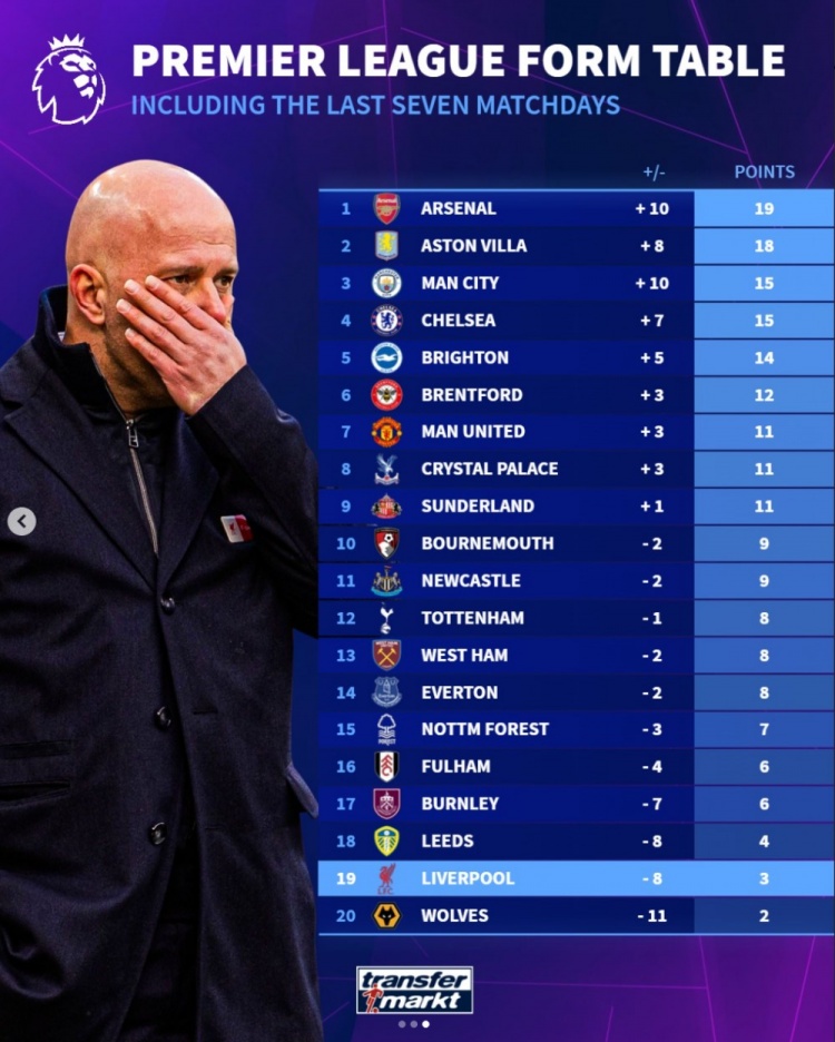 英超各队最近7轮联赛得分:阿森纳19分居首,利物浦仅3分倒数第二